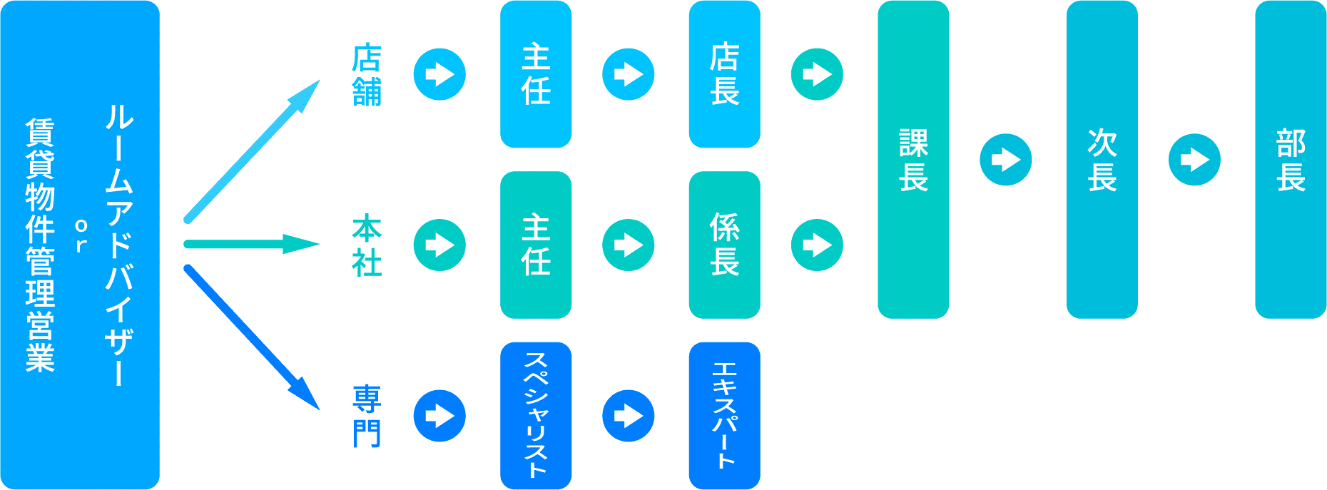キャリアパス CAREER PATH 従業員ひとり一人の希望や適性に応じたキャリアプランをご用意。 将来は管理者としてのマネジメントへの道だけではなく、現場のスペシャリストとしての道も目指せる職場環境があります。 MODELCASE営業部門 店員 早ければ3~4年で店長になれる場合もあります。店舗経営やオーナー様の資産管理を担う裁量の大きい、やりがいのあるポジションです。 本社部門 従業員が業務を円滑に遂行できるようにサポート。自社サービス向上の仕組み作り等、より経営の基盤となる位置に近いところでオンテックの未来を創る仕事です。